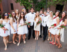 Throughout the commencement ceremony, the female graduates carry red roses while the male graduates wear a red rose boutonniere.