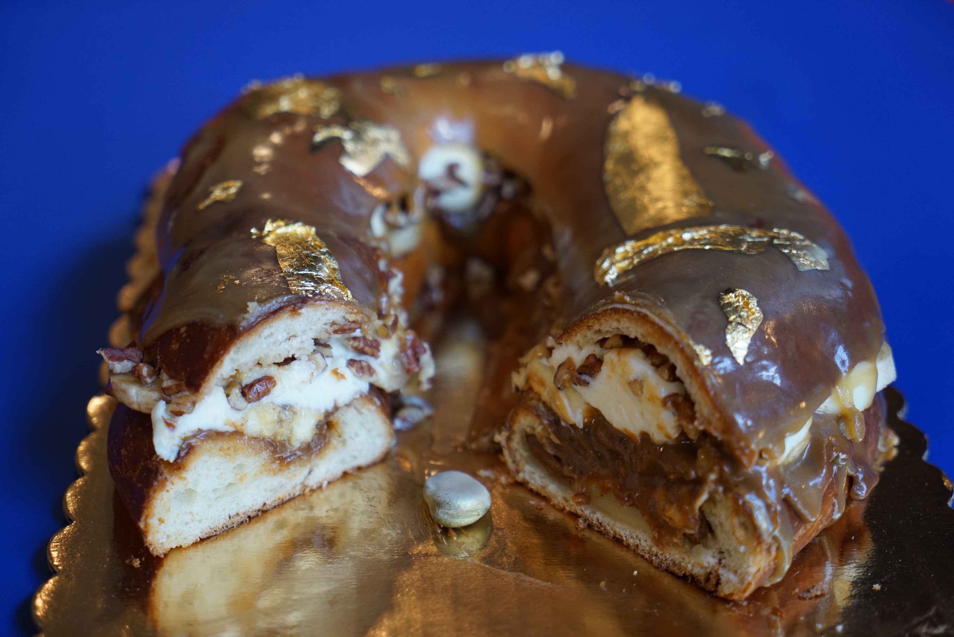 Get this – the cake is cut in half and stuffed with salted caramel, fresh bananas, toasted pecans, mascarpone cheese and carmello. It’s topped with a sweet praline glaze and garnished with gold leaf. This overflowing masterpiece is out of this world and instead of a plastic baby inside, there’s a fava bean! Cue the applause.
