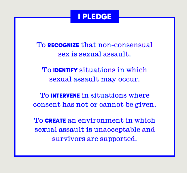 One of the main “action” steps of the It’s On Us campaign is to encourage students to complete an online “pledge” stating that they will intervene when necessary to stop sexual assault from ever happening.